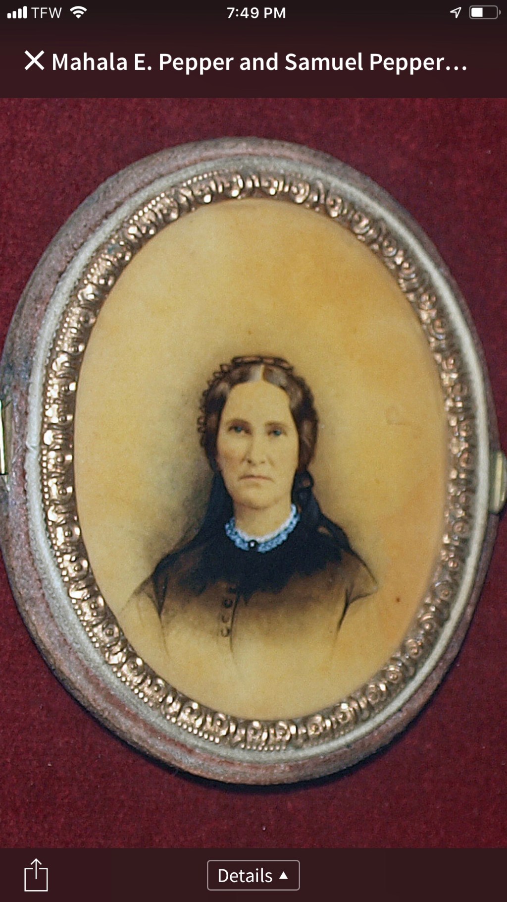 Mahala E. Perry was born on 22 February 1804, in Woodford County, Kentucky, the eldest child of Roderick Perry II (1776-1821) and Susanna Brown (1785-1853). With her three younger brothers and two younger sisters, Mahala grew up in a large home overlooking Glenns Creek, near the home of Elijah Pepper. She married Elijah’s son, Samuel (1802-1874), on 5 February 1824. Because Mahala and Samuel were neighbors, they probably had known each other since childhood. Her portrait and that of Samuel, shown above, were painted in the month in which they were married. Mahala and Samuel had one son and three daughters who lived to adulthood, including Mary Louise Pepper (1834-1874), nicknamed “Luta,” our great great grandmother. They lived in a beautiful home called Sweet Lawn. Mahala was 61 when she died in Frankfort, Kentucky on 4 March 1865.