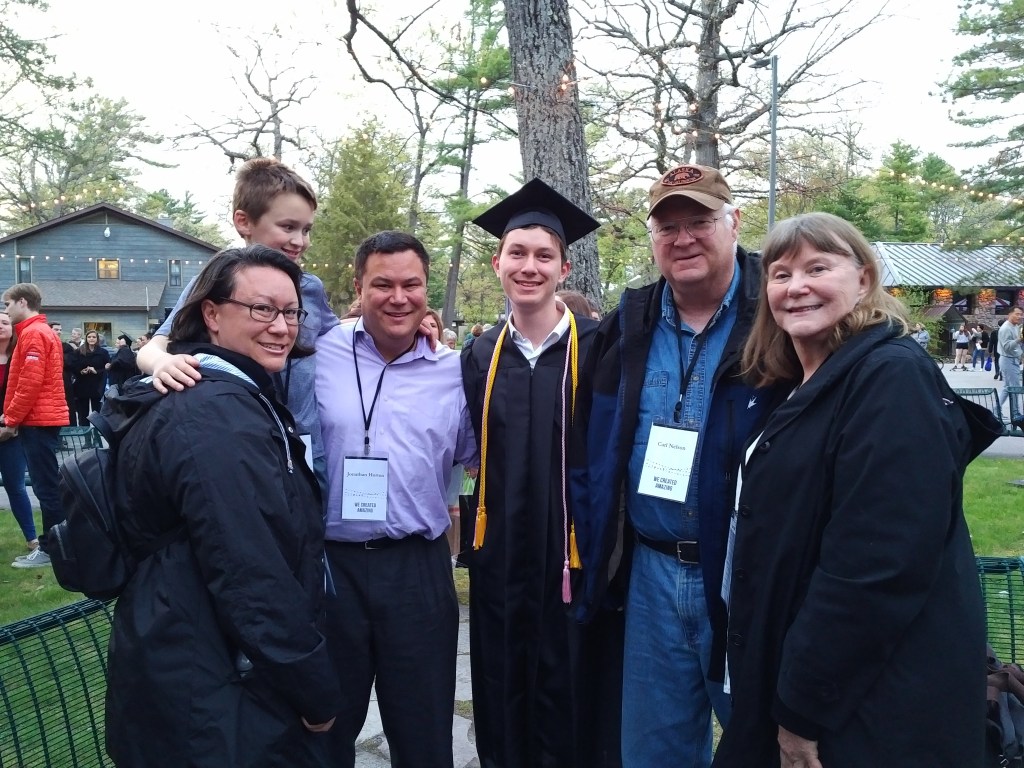Colleen, Ryan, Jonathan, Craig, Carl, and Linda at Craig’s graduation from Interlochen Academy for the Arts, May 2019.